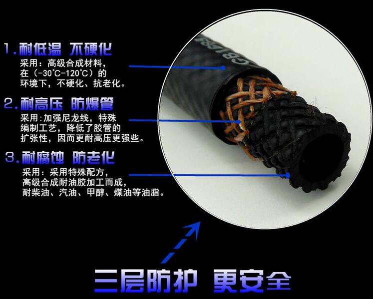 1.膠管選用特種合成橡膠配合制成,具有優良的耐油、耐熱、耐老化性能。